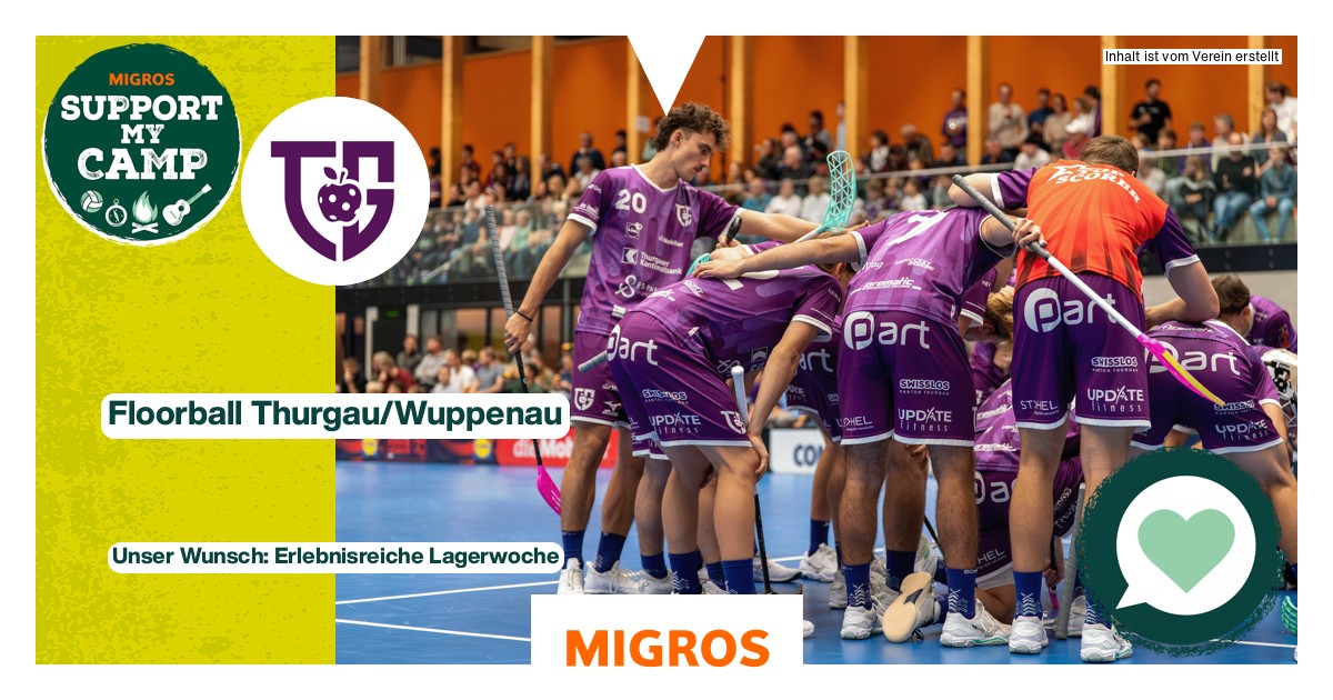 Mit der Aktion «Support My Camp» fördert die Migros die Durchführung von Vereinslagern für Kinder und Jugendliche. Auch Floorball Thurgau ist Teil der Aktion und freuen sich auf euren Support. Der daraus resultierende Bonus soll unserem Herbstlager zu Gute kommen.